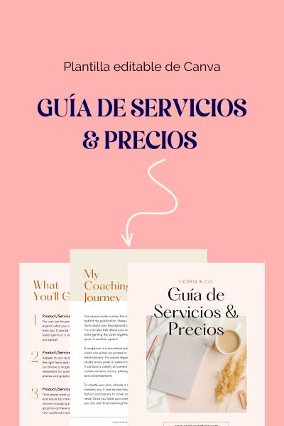 Guía de Servicios & Precios. Plantilla de Canva que podrás editar y amoldar a tu marca para mandar a potenciales clientes.